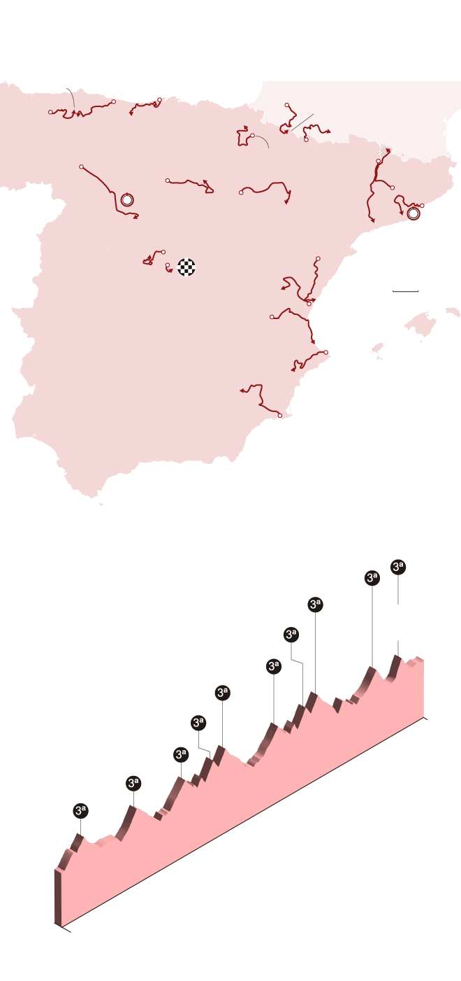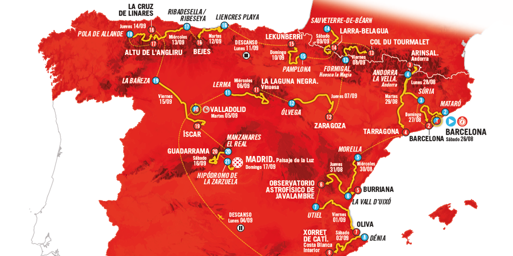 Camino del centenario, la Vuelta inclinada por el coloso de la montaña, puertos legendarios, antes que por su costumbre de los últimos lustros, las rampas de desniveles imposibles. Un recorrido que recorrió el Tourmalet y el Angliru y que concluyó en la sierra de Madrid con una etapa nunca vista, 10 cumbres de categoría en una etapa de 208 kilómetros. Una subida cada 20 kilómetros, a ritmo de clásico.